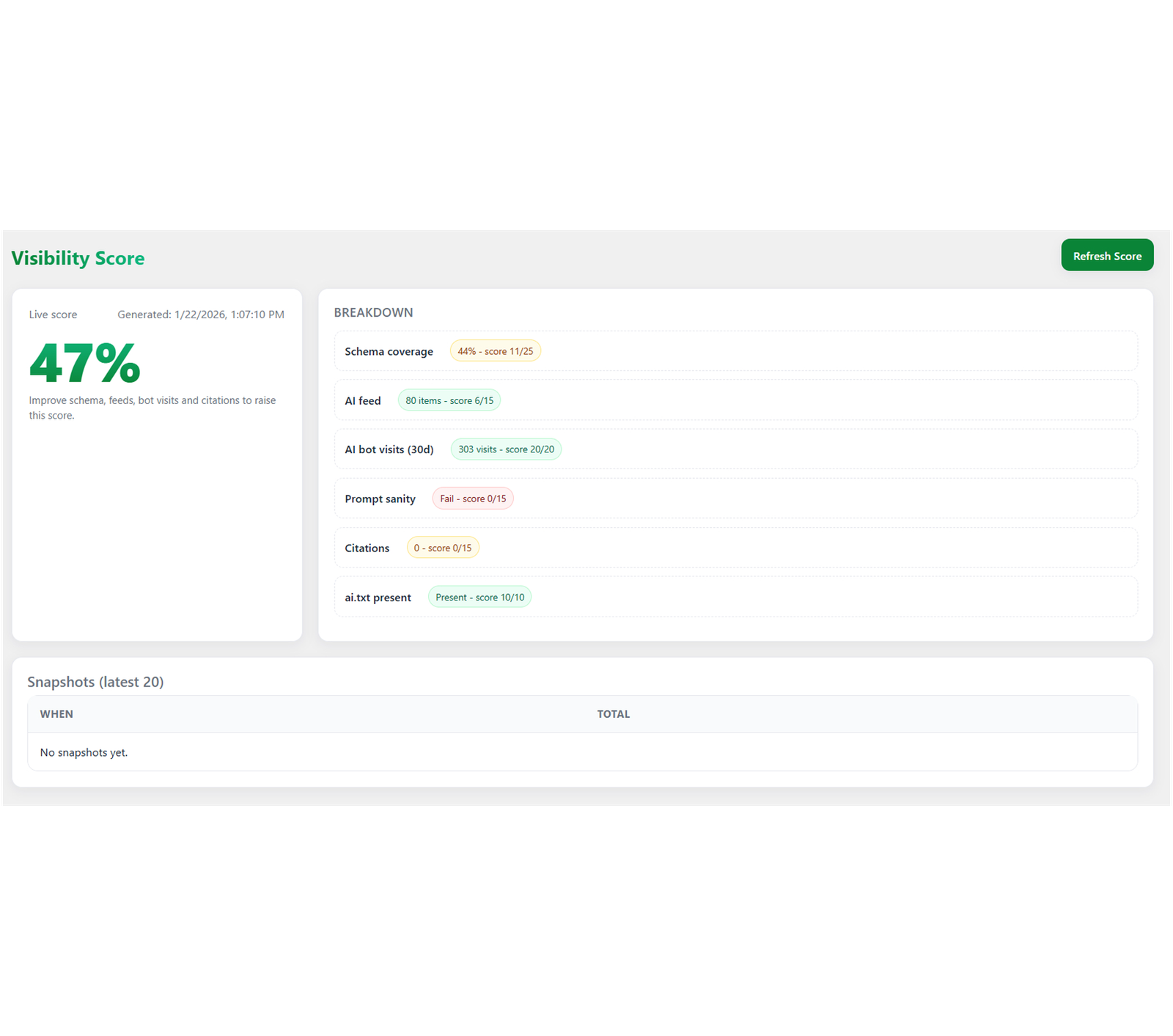 How it works:- It combines data from your schema health, feed status, and content clarity to give you a single performance grade.