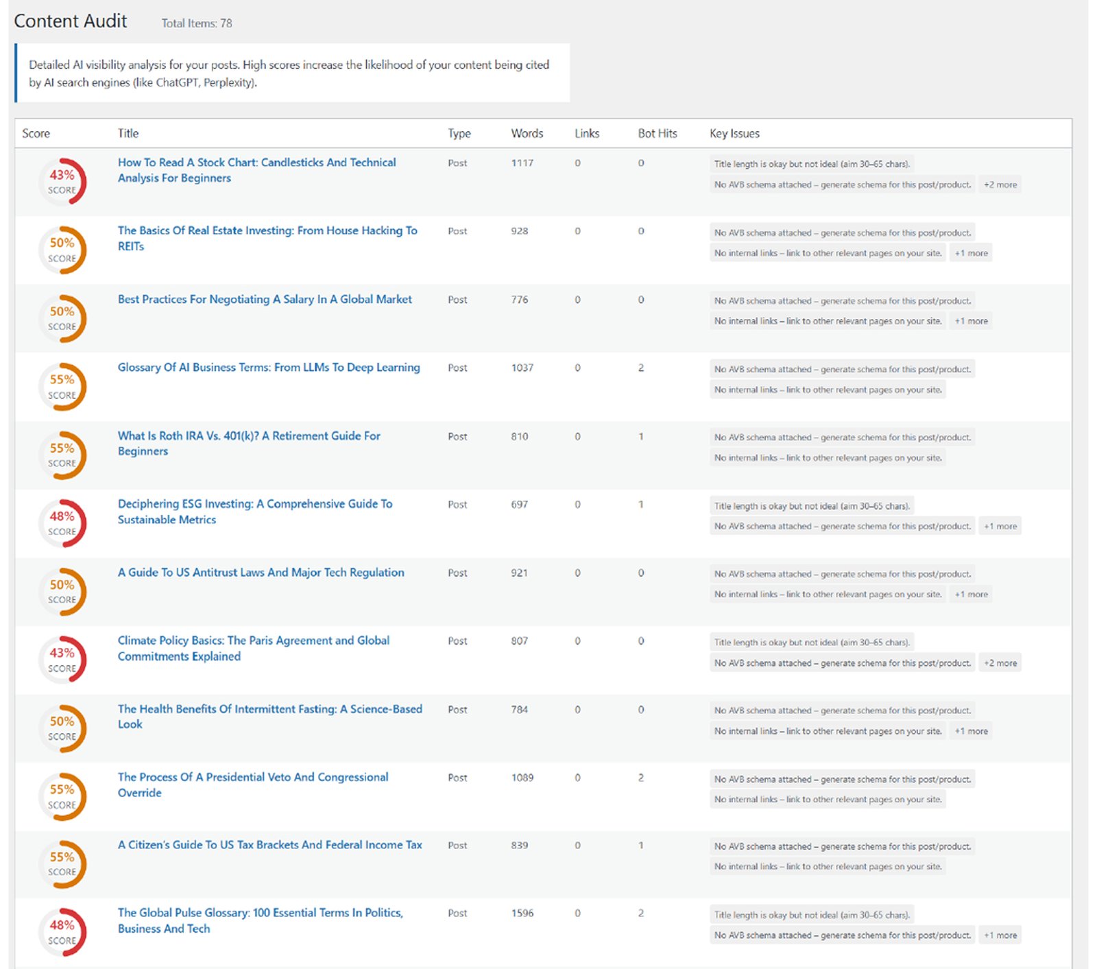 How it works:- It reads your posts and pages to check if they are machine-readable. It identifies content that is unstructured or missing key data points that AI bots look for.